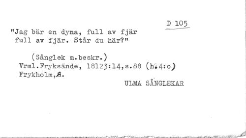 //// D 105 //// "Jag bår en dyna, full av fjär //// full av fjär. Står du här?" //// (Sånglek m.beskr.) //// Vrml.Fryksånde, 18123:14,s.88 (h;4:o) //// Frykho 1m . //// ULm SÅNGLEKAR ////