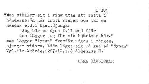 //// D 105 //// *Man ställer sig i ring utan att fatta i //// händerna.En går inuti ringen och tar en //// näsduk e.d.i hand.Sjunga: //// "Jag bär en dyna full med fjär //// den lägger jag för min hjärtans kär." //// man lägger "dynan" framför någon i ringen, //// sjunger vidare, båda lägga sig på knä på "dynan" //// Vgl.Ale-Skövde,2287:10,s.6 Aldenius,H. //// ULHA SÅNGLEKAR ////