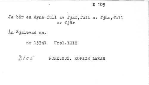 //// K JL^p //// Ja bär en dyna full av fjär,full av fjär,full //// av fjär //// Ån Själevad sn. //// nr 15341 Uppl.1918 //// - //// 2/CjT NORD.ms. KOPIOR LEKAR //// * ////