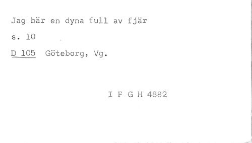//// Jag bär en dyna full av fjär //// s. 10 //// D 105 Göteborg, Vg. //// I F G H 4832 //// i //// 1 ////