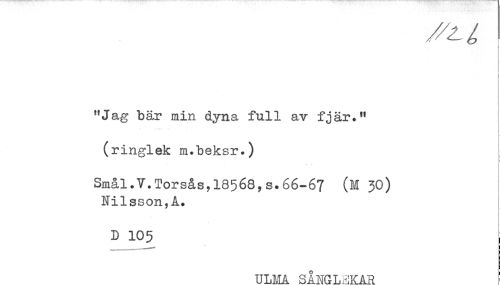 //// t //// - //// "Jag bär min dyna full av fjär." //// (ringlek m.beksr.) //// Smål.V.Torsås,18568yS.66-67 (M 30) //// Nilsson,A. //// D 105 ; //// ULMA SÅNGLEKAR ////