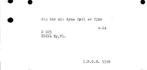 //// ! __ ' //// Jag bär min dyna fyll av fjär //// s.14 //// D 105 //// Södra Ny,VI. //// < //// i //// I.F.G.H. 5328 ////