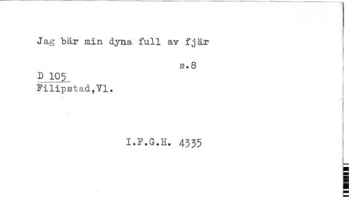 //// Jag "bär min dyna full av fjär //// s.S //// D 105 //// Filipstad,VI. //// i //// I.F.G.H. 4335 ////