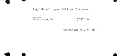 //// Jag bär min dyna full av fjär---- //// D 105 //// Torskinge,Sm. 7S97:16 //// . //// FOLKLIVSARKIVET LUND ////