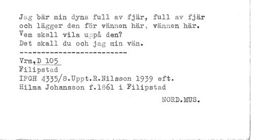//// Jag bär min dyna full av fjär, full av fjär //// och lägger den för vännen här. vännen här. : //// Vem skall vila uppå den? //// Det skall du och jag min vän. //// Vrm,D 105 //// Filipstad ; //// IFGH 4335/8.Uppt.R.Nilsson 193$ eft. ; //// Hilma Johansson f.l86l i Filipstad ' //// NORD.MUS. ' //// < //// t ////