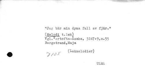 //// "Jag "bär min dyna full av fjär." //// (Melodi t.lek) //// Vgl.Vartofta-Åsaka, 3247:9,3.55 //// Be rgs t r and,Haj a //// ^^ (Lekmelodier) //// ULMå ////