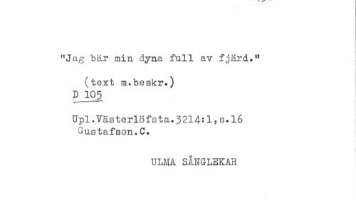 //// "Jag bär min dyna full av fjärd." //// (text m.beskr.) //// D 105 //// Upl.Västerlöfsta.3214:1,3.16 //// Gustafson.C. //// ULMA SÅNGLEKAR ////
