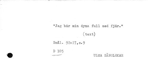 //// -— //// "Jag bär min dyna full med fjär." //// (text) //// Smål. 92:27,s.9 //// D 105 //// -----UI^A SÅNGLEKAR ////