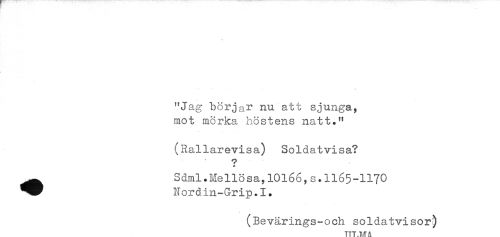//// "Jag börjad nu att sjunga, //// mot mörka höstens natt." //// (Rallarevisa) Soldatvisa? //// . ? //// * //// ^^ Sdml.Hellösa,10166,s.1165-1170 //// ^^ Nordin-Grip. I. //// (Bevärings-och soldatvisor) //// ITT .MA ////