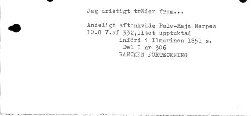 //// Jag dristigt träder fram... //// ^^ Ande ligt aftonkvåde Pale-Maja Nerpes //// ^^ 10.8 V.af 332,litet upptuktad //// införd i Ilmarinen 1851 s. //// Del I nr 3O6 //// RANCKEN FÖRTECKNING ////