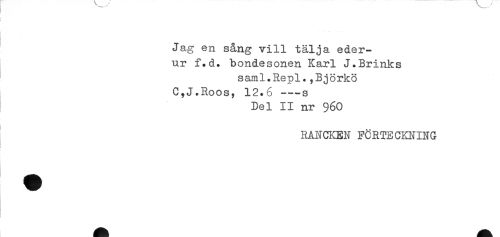 //// j . ' * - //// i //// Jag en sång vill tälja eder- //// ny f.d. bondesonen Karl J.Brinks //// saml.Repl.,Björkö //// C,J.Roos, 12.6 ---s //// Del II nr 96O //// ^ RANCKEN FÖRTECKNING //// 1 ////