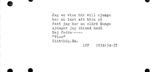 //// Jag en visa här vill sjunga //// har ni lust att höra på //// fast jag har en olärd lunga //// sjunger jag ibland ändå //// Hej fadra----- //// "Visa" //// I //// Slätthög.Sm. //// LUF 2834:34-37 ////