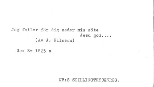 //// : //// C //// Jag faller för dig neder min söte //// Jesu god.... //// (Av J. Nilsson) //// Se: Zz 1825 a. //// KB:S SKILLINGTRYCKSREG. ////
