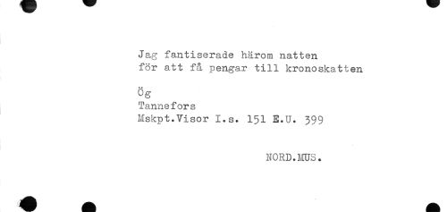 //// Jag fantiserade härom natten //// for att få pengar till kronoskatten //// Ög //// Tannefors //// Mskpt.Visor 1.s. l^l E.U. 399 //// NORD. ms. ////