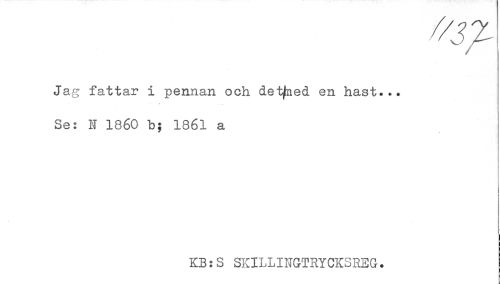 //// Jag fattar i pennan och det^ied en hast... //// Se: N 1860 b; 1861 a //// KB:S SKILLINGTRYCKSREG. ////