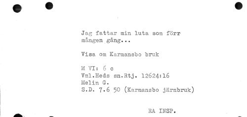 //// Jag fattar min luta som förr //// m&ngen gång... //// Visa om Karmansbo bruk //// M VI: 6 c //// Vml.Heds sn.Rtj. 12624:16 //// Helin G. //// S.D. 7.6 50 (Karmansbo järnbruk) //// RÅ INSP. ////