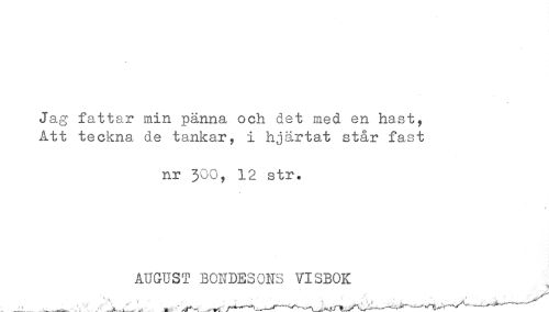 //// Jag fattar min panna och det med en hast, //// Att teckna de tankar, i hjärtat står fast //// nr 300, 12 str. //// AUGUST BONDESONS VISBOK ////