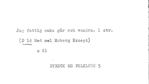 //// Jag fattig enka går och vandra. 1 str. //// (D 14 Med mel Moberg Except) //// s 61 //// / //// DYBECK MS FOLKLORE 5 ////