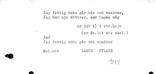 //// Jag fattig enka går här och vandrar. //// Jag har sju döttrar, men ingen måg //// nr 349 b) 4 str. Lo jo //// (ur Sv.lit s:s saml.) //// Jmf //// Jag fattig enka går och vandrar //// Me1.no t LAGUS NYLAND ////