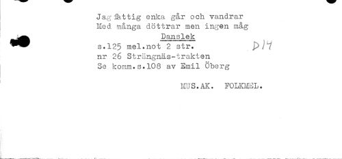 //// Jagjattig enka går och vandrar //// Med många döttrar men ingen måg //// ^^^ Danslek //// s.125 mel.not 2 str. //// nr 26 Strängnäs-trakten //// Se komm.s.108 av Emil Öberg //// HUS.AK. FOLKHEL. ////