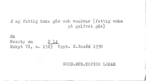 //// J ag fattig änka g&r och vandrar (fattig enka //// på golfvet går) ' //// Sk //// Nosaby sn P^Lå. //// Mskpt^VI, s. 1563 Uppt. H.Rosén 1930 . //// ! //// NORD.MUS.KOPIOR LEKAR ////
