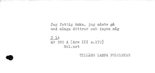 //// < //// Jag fattig änka, jag måste gå //// med många döttrar och ingen måg //// ILM //// nr 382 A (Arw III s.172) //// äel.not //// ^^ TILLÄGG LAr^tPA FOLKLEKAR ////