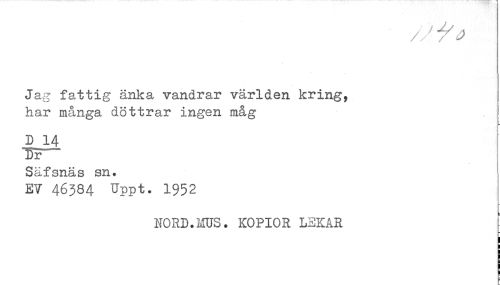 //// Jag fattig änka vandrar världen kring, //// har många döttrar ingen måg //// D 14 //// Säfsnäs sn. //// EV 46384 Uppt. 1932 //// NORD.ms. KOPIOR LEKAR ////