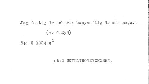 //// Jag fattig är och rik begynn"lig är min saga.. //// (av G.Ryd) //// Se: E I9O4 e^ //// KB:S SKILLINGTRYCKSREG. ////