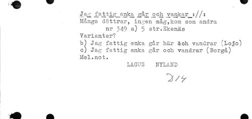 //// Ja.^ ^går ^ocjh vanka^r_://: //// Många döttrar, ingen måg,kom som andra //// nr 34$ a) 5 str.Ekenäs //// Varianter? //// b) Jag fattig enka gar här &ch vandrar (Lo#o) //// c) Jag fattig enka går och vandrar (Borgå) //// Mel.not. //// LAGUS NYLAND ////