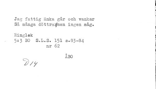 //// Jag fattig änka går och vankar //// Så många döttra^men ingen måg. //// Ringlek j //// $:3*B0 S.L.S. 151 s.83-84 //// nr 62 //// ÅBO ////