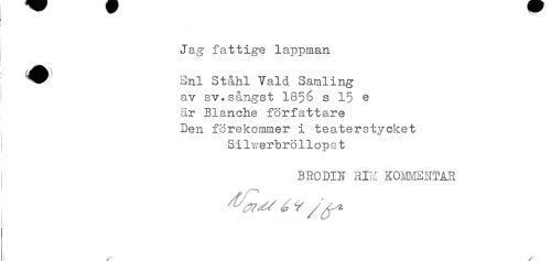 //// Jag fattige lappman //// i //// Enl St&hl Vald Samling //// av sv.sångst 18% s 15 e //// är Blanche författare //// Den förekommer i teaterstycket //// ; Silverbröllopet //// BRODIN RIH KOH^NTAR //// ^^ ^ ^ / ^ ////