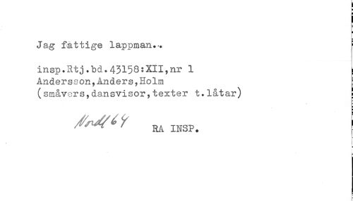 //// Jag fattige lappman... //// insp.Rtj.bd. 43158: XII, nr 1 //// Andersson,Anders,Holm //// (småvers,dansvisor,texter t.låtar) //// ^ v ^ //// ^ RA INSP. //// h //// S- ////