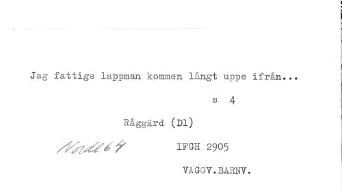 //// * //// Jag fattige lappman kommen l&ngt uppe ifrån... //// s 4 //// Råggärd (Dl) //// - //// * //// / IF&H 2905 //// VAGGV.BARNV. ////