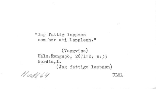 //// "Jag fattig lappman //// som bor uti Lapplann." //// (Vaggvisa) //// Eäls.Éengsjo, 26?1:2, s.33 //// Nordin,1. //// (Jag fattige lappman) //// ^^^^^ ULMÅ ////