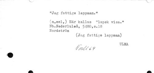 //// (m,mel,) Hår kallas "lapsk visa." //// Nb.Nederluleå, 5480,3.18" //// Nordström //// (Jag fattige lappman) //// ULMA ////