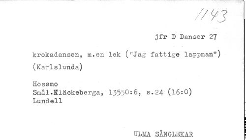//// jfr D Danser 2? //// — n ] //// krokadansen, m.en lek ("Jag fattige lappman") //// (KarIslunda) //// Hossmo //// Smål.Eläckeberga, 13550:6, s.24 (l6:0) //// Lundell //// ULHA SÅNGLEKAR ! ////