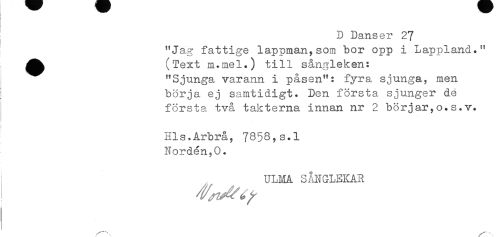 //// ; D Danser 27 //// ] //// "Jag fattige lappman,som bor opp i Lappland." //// ^^ (Text m.mel.) till sångleken: //// "Sjunga varann i påsen": fyra sjunga, men //// börja ej samtidigt. Don. första sjunger dé //// första, två takterna innan nr 2 börjar,o.s.v. //// < - //// Hls.Arbrå, 7858,s.l //// Norden,0. //// ULMA SÅNGLEKAR ////