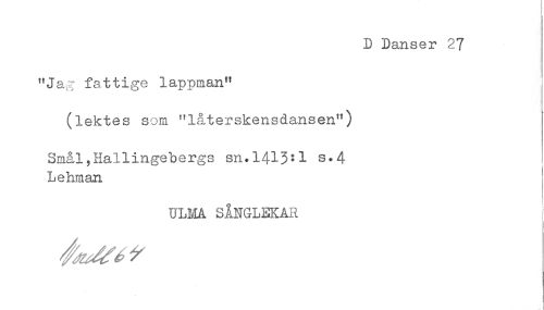 //// "Jag fattige lappman" //// (lektes som "lå,terskensdansen") //// Sm&lyHallingebergs sn.1413*1 s*4 //// Lehman //// ULlvIA SÅNGLEKAR [ //// / ^ ^ ////