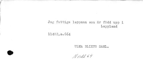 //// Jag fattige lappman som är född upp i //// Lappland //// 11482,s.664 //// ULMA BLIXTS SAHL. ////
