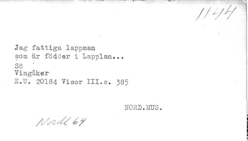 //// //yy //// Jag fattiga lappman //// som år fodder i Lapplan... //// So //// Vingåker //// E.U. 20184 Visor III.s. 38$ //// NORD. HUS. ////