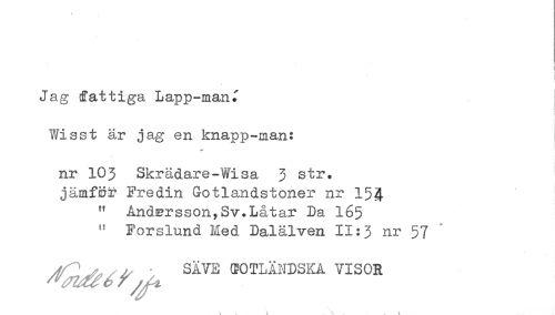 //// Jag fattiga Lapp-man^ //// Wisst år jag en knapp-man: //// nr 103 Skrädare-Wisa 3 str. //// jämför Fredin Gotlandstoner nr 15g. //// " Andersson,Sv.Låtar Da 165 //// " Forslnnd Eed Dalälven 11:3 nr 57 * //// ^ ^ SÄVE GOTLÄNDSKA VISOR //// \ . t \ . * \ ////