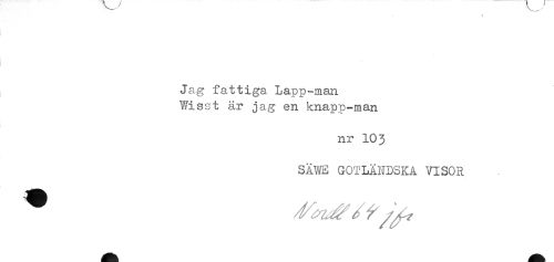 //// Jag fattiga Lapp-man //// Wisst år jag en knapp-man //// nr 103 //// SÄWE GOTLÄNDSKA VISOR ////
