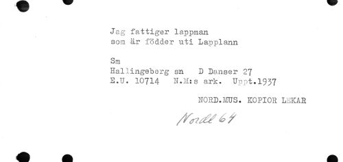 //// Jag fattiger lappman //// som är födder uti Lapplann //// Sm //// Hailingeberg sn D Danser 27 //// E.U. IÖ714 N.M:s ark. Uppt.1937 //// NORD.MUS. KOPIOR LEKAR ////