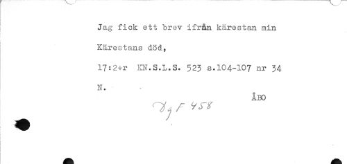 //// ! //// ! //// Jag fick ett brev ifrån kärestan min //// i //// Kärestans död, //// 17:2+r KN.S.L.S. 523 S.IO4-IO7 nr 34 //// N. //// ÅBO ////