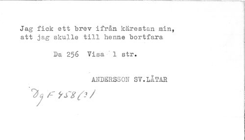 //// Jag fick ett brev ifrån kårestan min, //// att jag skulle till henne bortfara //// Da 256 Visa 1 str. //// ANDERSSON SV.LÅTAR ////