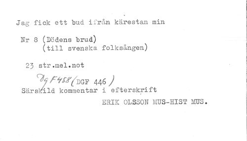 //// Ja^r fick ett bud ifrån kärestan min //// Nr 8 (Dödens brud) //// (till svenska folksången) //// 23 str.mel.not //// fl* ^^^ ^ //// y^^^ DGF 446 / //// Särsl-Ald kommentar i efterskrift //// ERIK OLSSON MUS-HIST MUS. ////