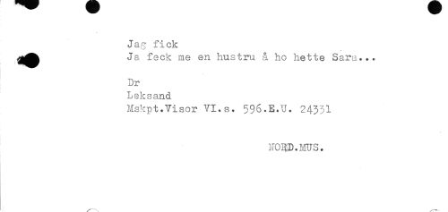 //// Jag fick //// Ja feck me en hustru å ho hette Sara... //// Dr //// i //// Leksand //// Mskpt.Visor VI. 3. 596.E.U. 243;.'l //// NORD.MUS. ////