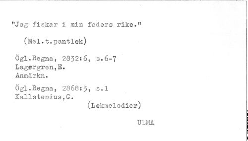 //// "Jag fiskar i min faders rike." //// (Mel.t.pantlek) //// ögl.Regna, 28)2:6, s.6-7 //// Lag^rgren,E. //// Anmärkn. //// Ögl.Regna, 2868:3, s.l //// Kallstenius,G. //// (Lekmelodier) //// ULivIA ////