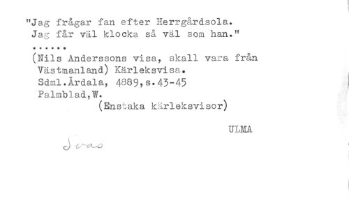//// "Jag frågar fan efter Herrgårdsola. //// Ja får väl klocka så väl som han." //// # V € # # # //// (Nils Anderssons visa, skall vara från //// Västmanland) Kärleksvisa. //// Sdml.Årdala, 4889,s.43-45 //// Palmblad, W. //// (Enstaka kärleksvisor) //// ULMA //// < ////