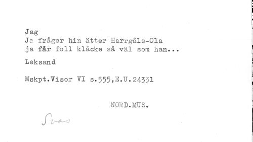 //// Jag //// Ja frågar hin ätter Harrg&ls-Ola //// ja får foll klåcke så väl som han... //// Leksand //// Mskpt.Visor VI s.555?E^U.24331 //// < //// NORD.MUS. //// Jl ////